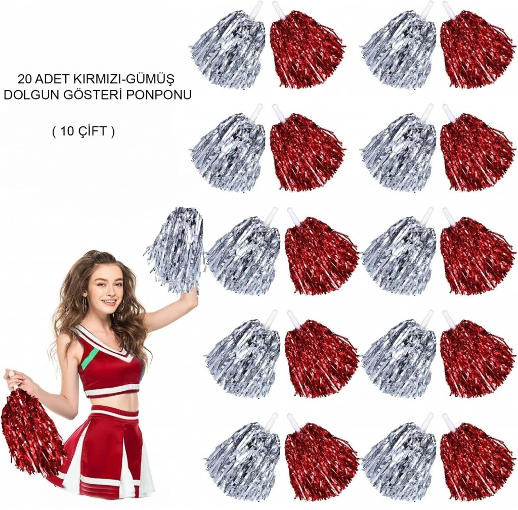Kırmızı Gümüş Metalik Dolgun Gösteri Ponponu 20 Adet (10 Çift)