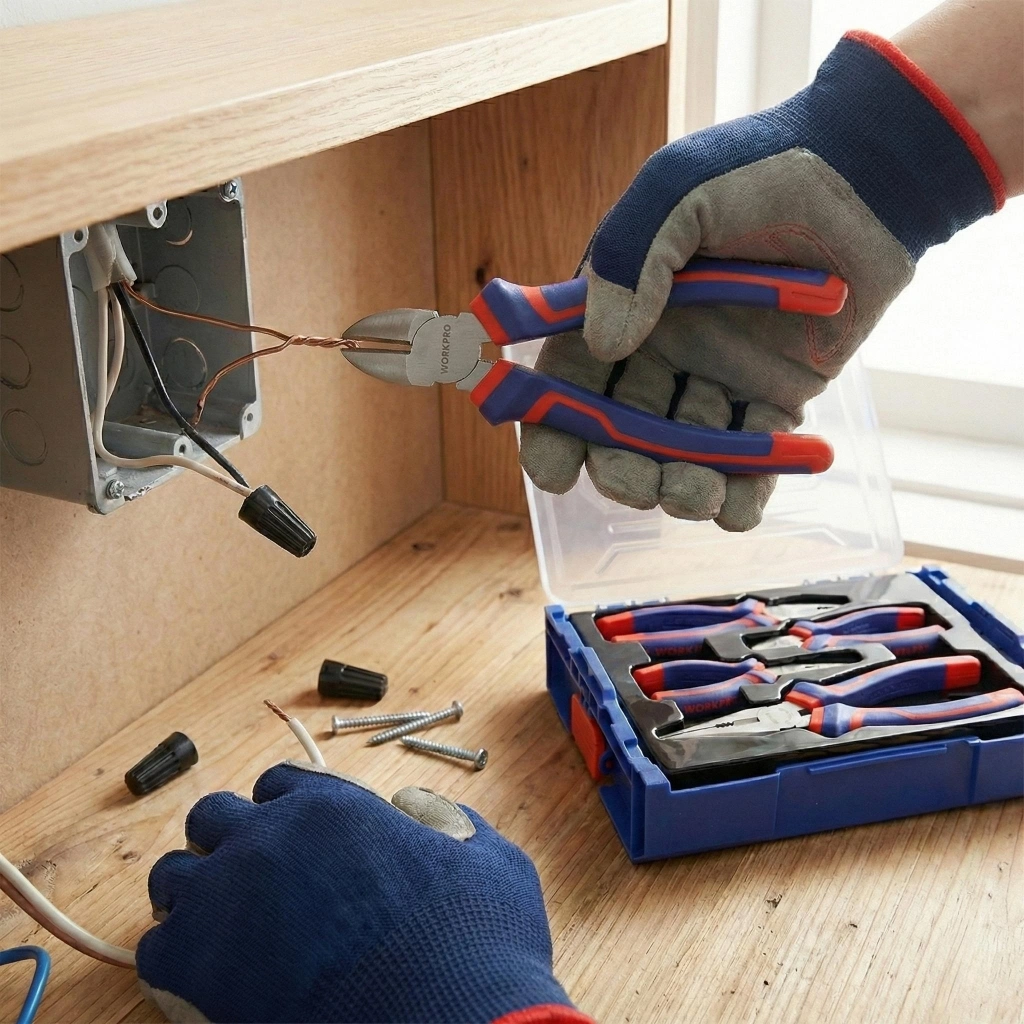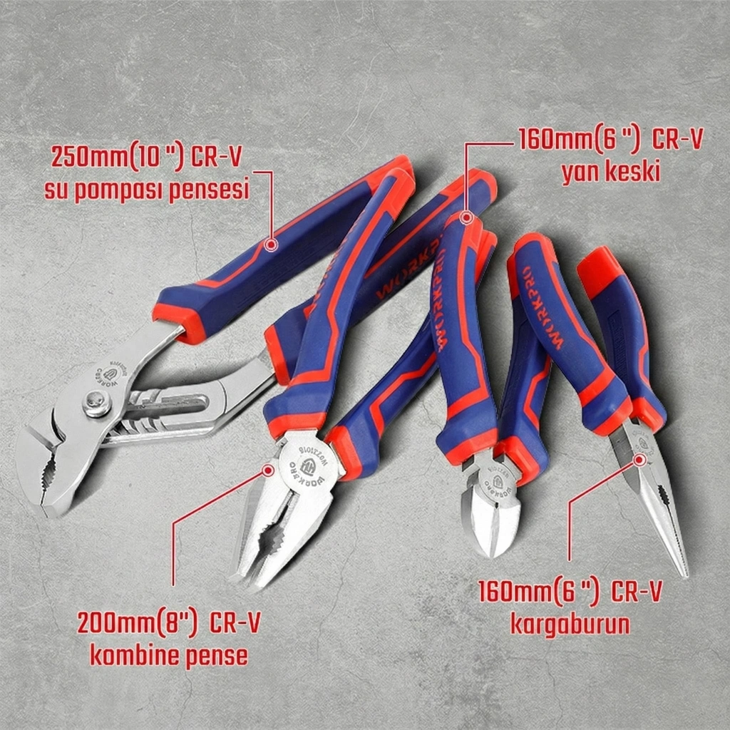 • WORKPRO WP209133 4 Parça Profesyonel Pense Seti • 200mm Kombine Pense, 160mm Yan Keski, 160mm Kargaburnu ve 250mm Ford Pense olmak üzere 4 parçadan oluşmaktadır. • Sanayi, İnşaat, Otomotiv, Şantiye, Acil durumlar gibi mekanik veya her türlü elektrikli, elektronik aletlerin bakım ve onarımlarında profesyonel ve uzun ömürlü kullanım için aşınmaya ve paslanmaya dayanıklı Ni-Fe alaşımlı paslanmaz dövme karbon çelik malzemeden üretilmiştir. • Yüksek kaliteli Ni-Fe dövme karbon çelik kullanılmıştır, hassas ve ısıl işlemden sonra kesme ve kavrama dişleri daha sert ve dayanıklı hale getirilmiştir. • Pense uçları ve kesici dişler yüksek baskı mukavemetli modifiye edilmiş dövme karbon çelikten üretilmiştir. • 250mm Fort Pense hızlı ve kolay sıkma, sökme yapmanızı sağlar. • Ni-Fe alaşım, pas ve korozyon gibi dış etkenlerden koruyarak uzun ömürlü yapı kazandırır. • %30 daha geniş Üst düzey kauçuk kaplama sap tasarımı kaymayı önler, el yorgunluğunu azaltır. • Özel tasarım plastik muhafaza ve taşıma çantası ile aletlerinizi temiz ve güvenli bir şekilde saklamanıza imkân sağlar. • Özel tasarlanmış kilitli taşıma çantası sayesinde birden fazla aynı çantayı üst üste koyup kilitleme mekanizması ile güvenle taşımanıza imkân sağlar.
