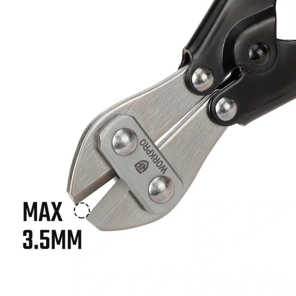 • WORKPRO WP216001 200mm Profesyonel Tel Kesme Makası • Çelik halat, Tel örgü, Gijon Saplama Tij, Çivi, Vida gibi çeşitli malzemelerin kesilmesi için son derece sağlam 65MN çelikten üretilmiş kesici çenelere sahiptir. • 65MN çelikten üretilmiş yapısı ile uzun ömürlü profesyonel kullanım imkânı sağlar. • 65MN çelikten üretilmiş kesici çeneler keskinliğini korur 3,5mm kalınlığında her türlü metal çubukların kesimi için idealdir. • Çelik yay destekli açılır kapanır mekanizma sayesinde tek elle kolayca kesim yapmanızı sağlar. • Kompakt yapısı sayesinde kolay manevra yaparak kesim yapmanızı sağlar. • 65MN çelikten üretilmiş çene yapısı, pas ve korozyon gibi dış etkenlerden koruyarak uzun ömürlü yapı kazandırır. • Üst düzey çift katmanlı kauçuk kaplama sap tasarımı kaymayı önler, el yorgunluğunu azaltır. • Kilitlenmeyi sağlayan entegre kilit mekanizması ile güvenli kullanım sağlar. • Mak. Kesme Çapı. 3,5mm • Makas Boyu. 200mm