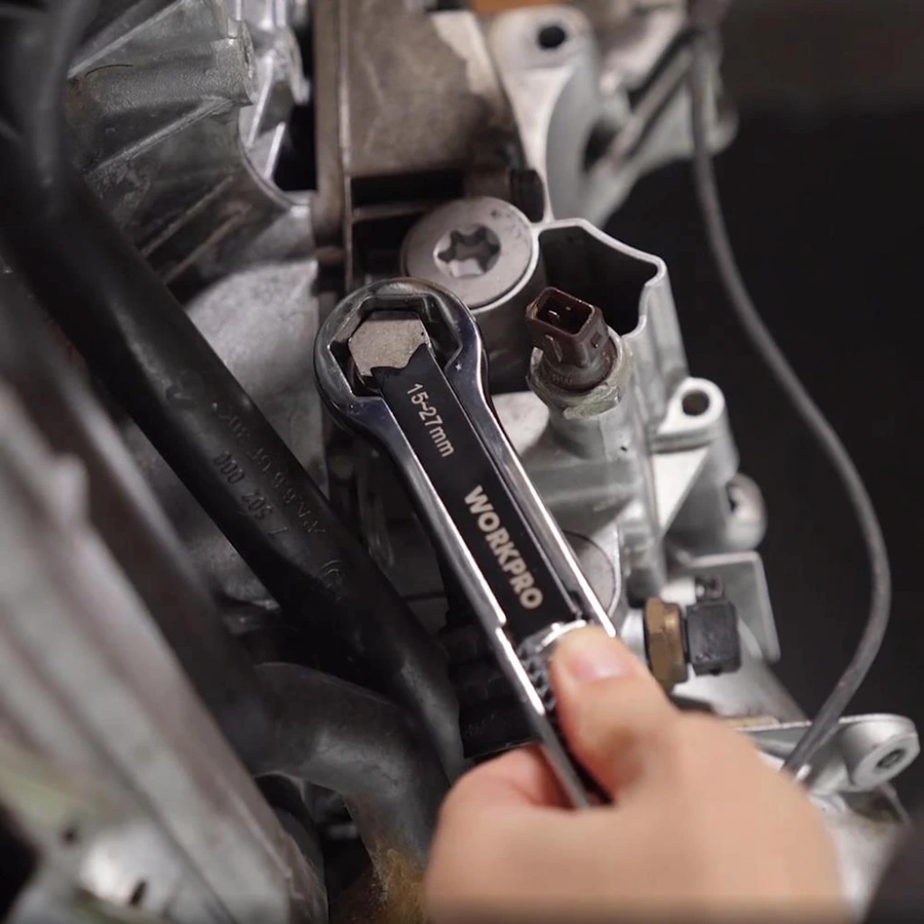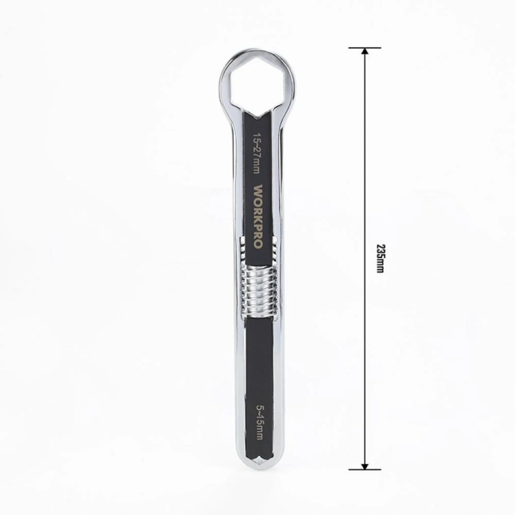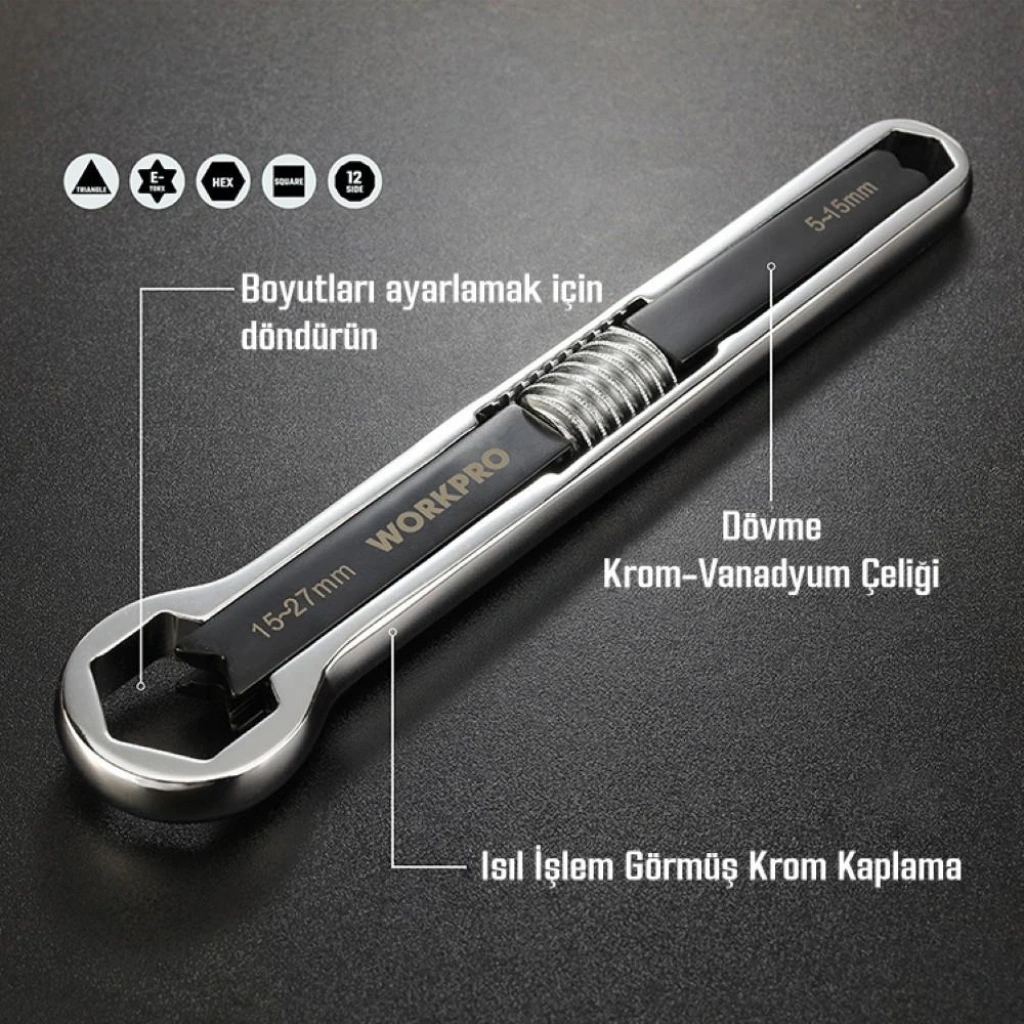 • WORKPRO WP272016 5/27mm CR-V Üniversal Ayarlanabilir Çift Başlı Anahtar • Sanayi, İnşaat, Otomotiv, Şantiye gibi her türlü mekanik alet gerektiren işlerde, her türlü cıvata, paslanmış veya boyalı somun ve mekanik aletlerin bakım ve onarımlarında profesyonel ve uzun ömürlü kullanılabilmesi için aşınmaya ve paslanmaya dayanıklı CR-V dövme çelik malzemeden üretilmiştir. • Ayarlanabilir çift başlı ağız açıklığı ve V şekilli mengene dişi sayesinde tek bir anahtar ile 5mm’ den 27mm’ye kadar cıvata/somun başlı vidaların sıkılıp sökülmesi için tasarlanmıştır. • Kurbağacık anahtarların, açık ağızlı anahtarların ve fort penselerin kavrayamayacağı kadar düzleşmiş somun veya cıvataların kolay bir şekilde açılmasında veya sıkılmasında üstün performans ve kolaylık sağlar. • Cıvata boyutlarına göre ayarlanabilir çift yönlü sap tasarımı sayesinde son derece hızlı ve kolay sıkma ve sökme imkânı sağlar. • Kavrama çene ve gövdesi yüksek baskı mukavemetli modifiye edilmiş dövme çelikten üretilmiştir. • Yüksek kaliteli dövme çelik kullanılarak hassas ve ısıl işlemden sonra kavrama çeneleri daha sert ve dayanıklı hale getirilmiştir. • Krom kaplama dövme çelikten üretilmiş yapısı, pas ve korozyon gibi dış etkenlerden koruyarak uzun ömürlü yapı kazandırır. • Hem metrik hem de INC ölçü birimi cıvata ve somun başlı vidalarda tam uyum sağlar. • Tek anahtar ve iki başlı anahtar ağzı ile bir ucu ile 5-15mm diğer ucu ile 15-27mm kadar olan cıvataların sıkma sökme işlemini profesyonelce yapmanızı sağlar. • Ağız Açıklığı: 5-15mm / 15-27mm (3/16” – 19/32” * 19/32”- 1- 1/16”)