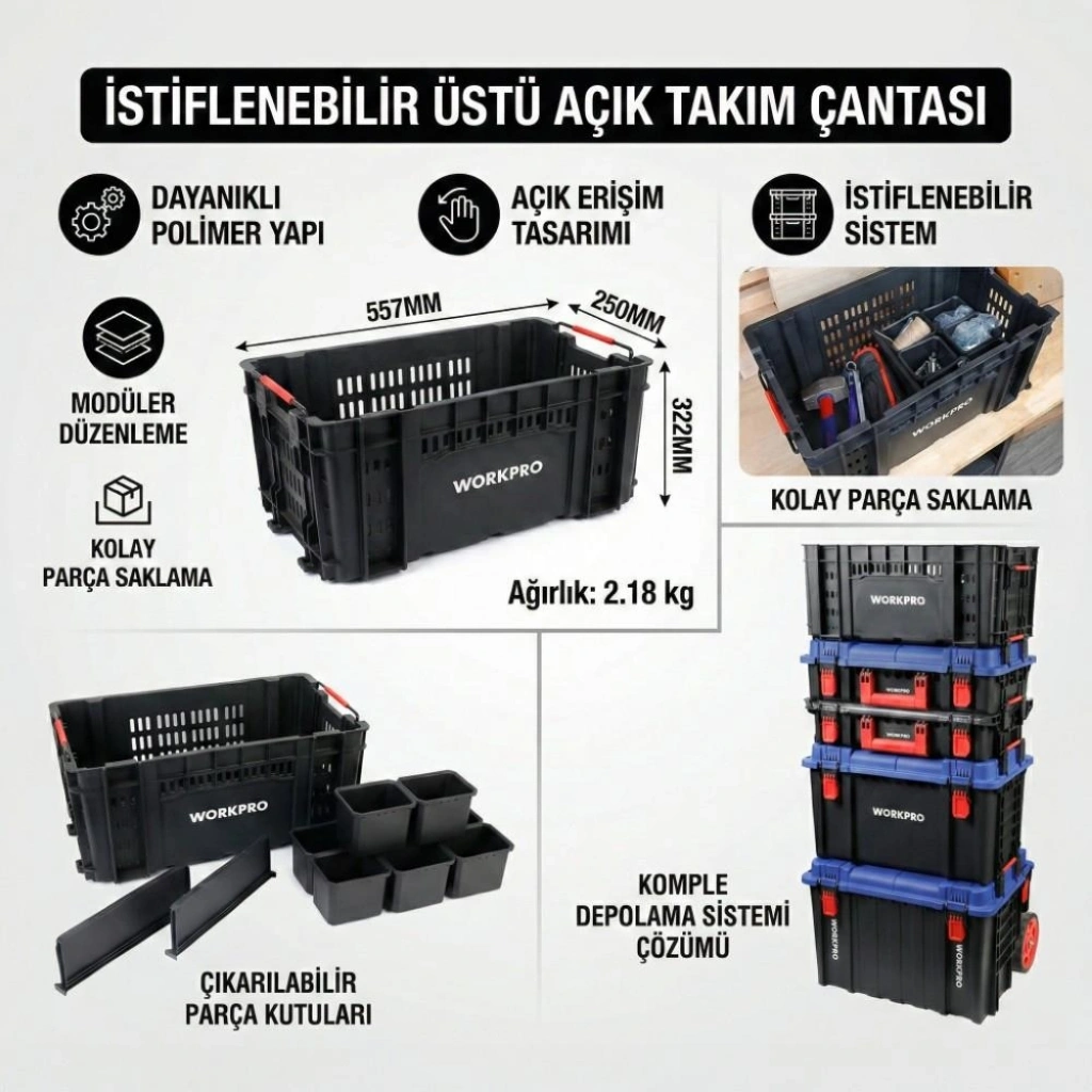 • WORKPRO WP283028 46Lt 55,7x32,2x25cm Üstü Açık Profesyonel Takım Çantası • Elektrik, Sıhhi tesisat işleri, montaj ve servis bakım uygulamaları, atölye ve ev tipi tamirat tadilat uygulamalarında, matkap, şarjlı vidalama, matkapların taşınmasında, Vida, dübel, bağlantı elemanları ve küçük/büyük el aletlerinin düzenli ve güvenli şekilde saklanması için tasarlanmış, darbelere karşı dayanıklı sağlam PP gövdesi sayesinde profesyonel ve günlük kullanıma uygun 25kg. Taşıma kapasitesine sahip çok amaçlı üstü açık takım taşıma çantasıdır. • Matkaplar, avuç taşlama makinaları, dekupajlar ve diğer tüm elektrikli veya mekanik el aletlerinizi profesyonelce taşımanız veya güvenle muhafaza etmeniz için tasarlanarak üretilmiştir. • Darbelere ve aşınmaya dayanıklı PP (Polipropilene) gövde, zorlu şantiye ve atölye koşullarına uygun profesyonel sağlam yapıya sahip takım çantasıdır. • Son derece kompakt ve istiflenebilir tasarımı sayesinde birden fazla Workpro organizer veya takım çantaları ile üst üste istiflenerek kilitlenebilir metal kilit mekanizması sayesinde depolama alandan tasarruf etmenizi sağlar. • İç ve dış mekân koşullarına dayanıklı sağlam gövde ile uzun ömürlü kullanım. • Ölçüler: 557 x 322 x 250mm (46 Lt.) • Taşıma Kapasitesi: 25Kg.